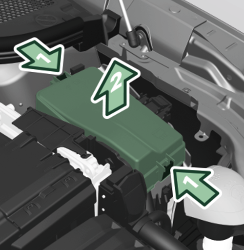 - Pressione e segure os botões de bloqueio na tampa da caixa de fusíveis.