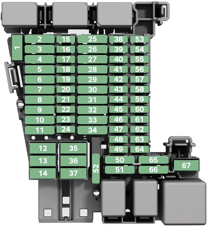 | 44 | Iluminação do habitáculo à frente, travão de estacionamento, sensor de chuva e luz, operação das luzes, sistema de alarme, ligação de diagnóstico, faróis dianteiros |